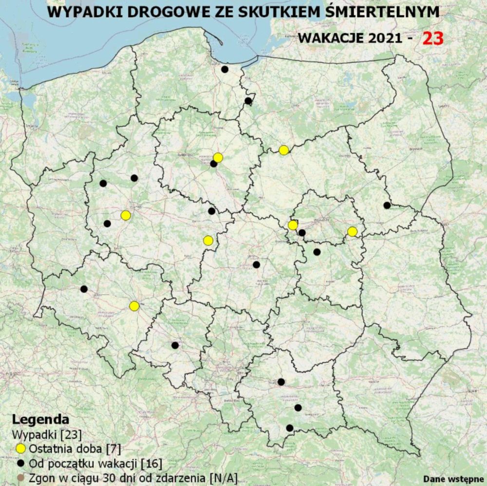 Od początku wakacji (w ciągu zaledwie kilku dni) na polskich drogach zginęło ponad 20 osób. Mapa jest na bieżąco aktualizowana, żeby zwrócić uwagę na skalę tragedii do jakich dochodzi na drogach. Oby tych czarnych punktów było jak najmniej, ale to w dużej mierze zależy od nas - użytkowników dróg.