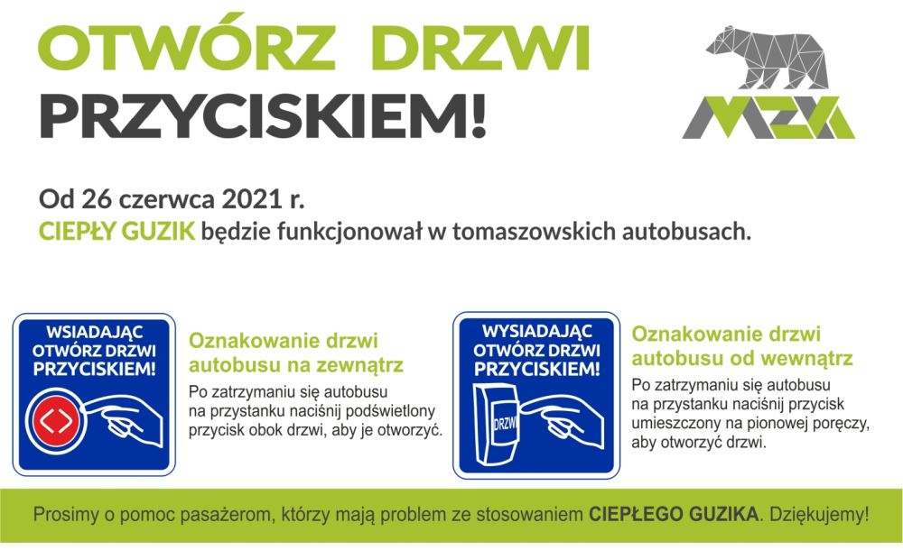 - Wyjątkiem od stosowania "ciepłego guzika" mogą być sytuacje, gdy kierowca zauważy na przystanku lub w autobusie pasażera z ograniczoną mobilnością, np. niepełnosprawnego – mówi A. Przybysz. - W początkowej fazie uruchomienia systemu otwierania drzwi autobusów prosimy pasażerów o cierpliwość i wyrozumiałość, a osoby sprawnie korzystające z tego rozwiązania o pomoc dla tych, którzy mogą mieć problem z użytkowaniem tej nowinki technicznej - dodaje dyrektor ds. techniczno-eksploatacyjnych w MZK.