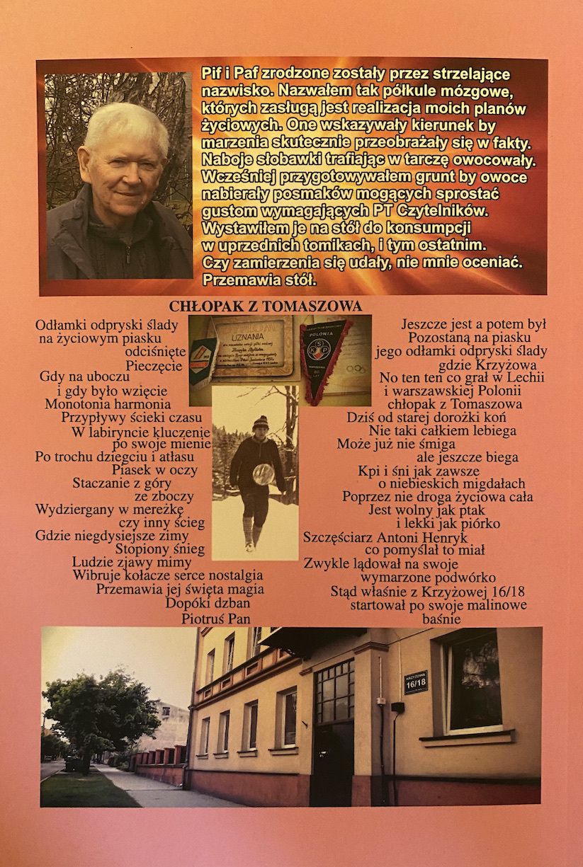 Jest w nim wszystko, wspomnienia, fraszki, epigramy. Można zachwycać się przyrodą, podsumowywać to, co było, i z tego byłego wyciągać wnioski. Pisze, że "czytelnika nie obchodzi specjalnie forma, w jakiej treść jest przekazywana", i tu chyba nie ma racji. Trudno czytelnikowi nadążyć za myślą autora. A może tylko ja nie mogę? Książeczka jest bardzo kolorowa, nie tylko barwnymi fotografiami, których autor pomieścił w tomiku wiele, ale i barwami jego życia. Niech to oceniają czytelnicy, do których tomik trafi, a trafi do wybranych, do przyjaciół i krewniaków. Autor sam ich wybierze. Tak czy owak, książeczka jest bardzo tomaszowska w treści i ilustracji. Autor prosił mnie, by zasygnalizować czytelnikom, tym wybranym, tym, którzy poznali pięć poprzednich tomików, że ten jest już szósty i nosi tytuł "Posmak życia".