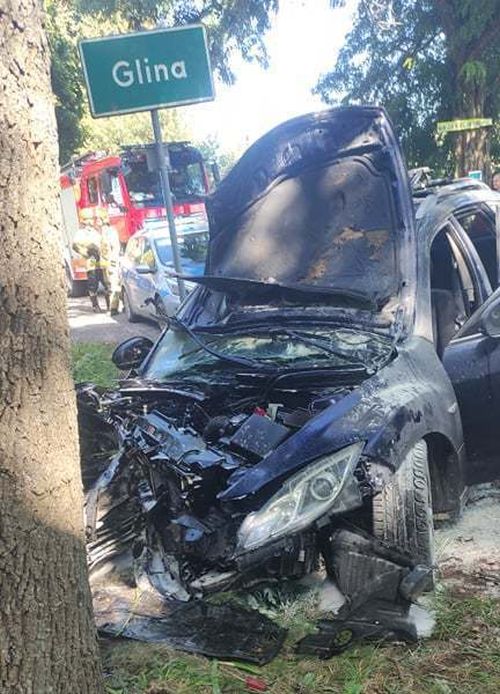 Mazda uderzyła tam w przydrożne drzewo. Kierowca i jego pasażerka potrzebowali pomocy medycznej. Trafili do szpitala.