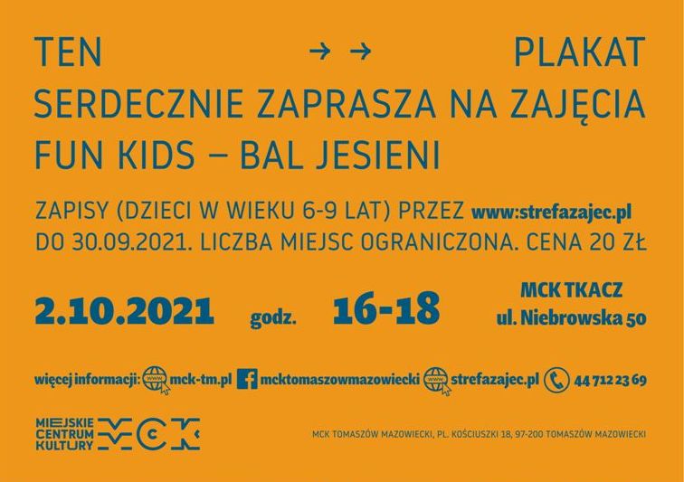 Fun Kids to nowy cykl zajęć dla dzieci w wieku 6-9 lat, które będą odbywać się w każdą pierwszą sobotę miesiąca w Miejskim Centrum Kultury Tkacz przy ul. Niebrowskiej 50. Zainauguruje je 2 października "Bal jesieni". Początek o godz. 16.