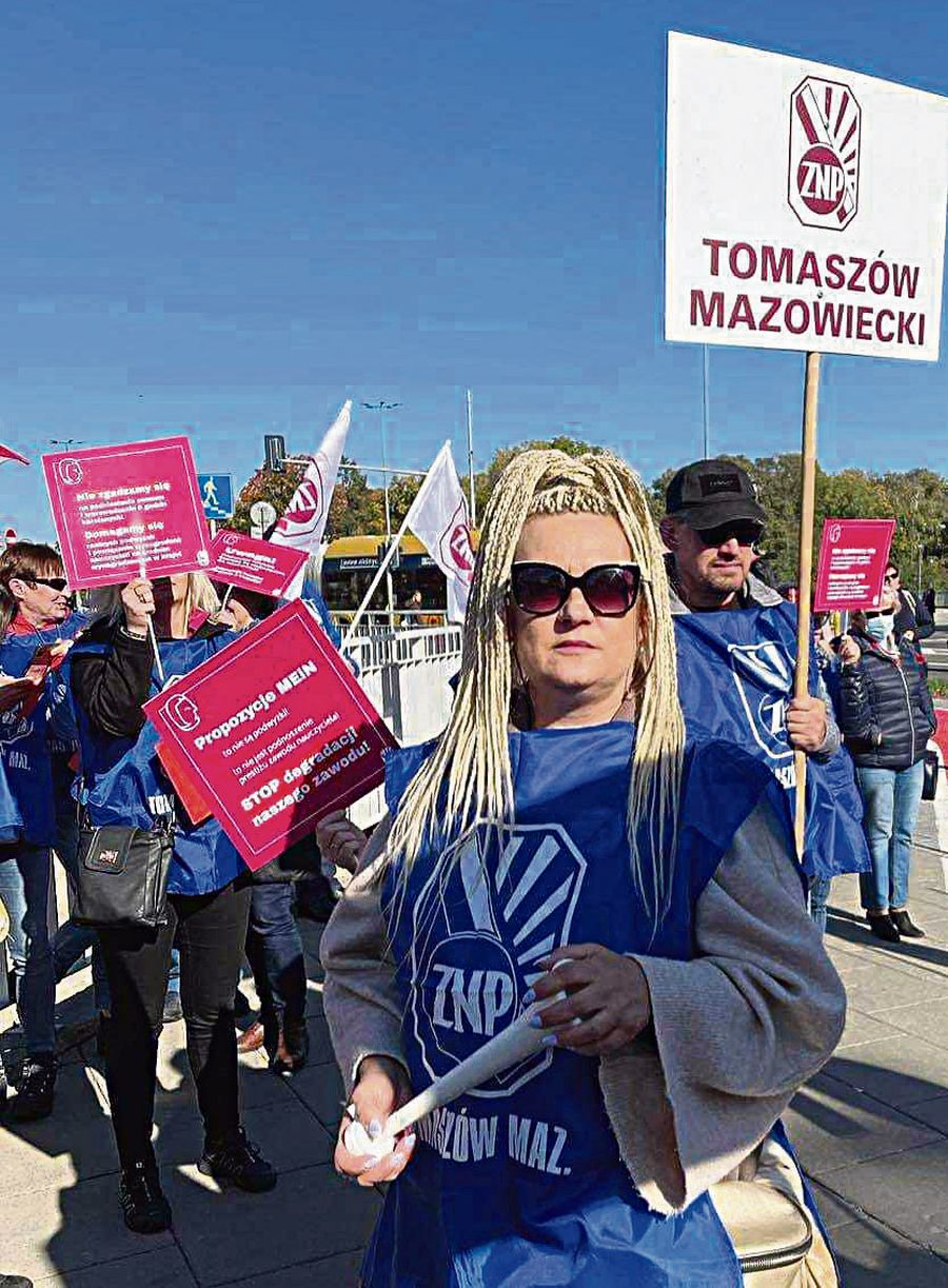Przed Ministerstwem Rodziny i Polityki Społecznej manifestowali inni pracownicy budżetówki, którzy domagali się podwyżki płac. Protest nauczycieli organizował Związek Nauczycielstwa Polskiego. Nie był to jeszcze strajk, ale pikieta. Odbywała się pod hasłem:" "Dość arogancji i braku szacunku dla nauczycieli". Przyjechali nauczyciele z różnych stron Polski. Mieli ze sobą transparenty z napisami: "Edukacja nie indoktrynacja", "Czarnek nie będzie nam pluł w twarz", "Czarnek! Przegięliście!" Wśród pikietujących byli też pedagodzy z Tomaszowa i powiatu, którzy przyjechali autokarem i prywatnymi samochodami. Udział w manifestacji zorganizował tomaszowski oddział ZNP, na którego czele stoi Renata Szadkowska. Protestowali przeciwko ogłoszonym w połowie września przez Ministerstwo Edukacji i Nauki propozycjom zmian w ustawie Karta nauczyciela. - Deklarowana przez ministra Przemysława Czarnka "podwyżka" płac kosztem zwiększenia pensum, wprowadzenia nowych "godzin karcianych" i odebrania niektórych dodatków, a także zmniejszenie odpisu na fundusz socjalny, oznacza, że nauczyciele sami sfinansują pozorny wzrost wynagrodzeń - informuje Renata Szadkowska. - Wszystkie te proponowane zmiany, które faktycznie nie podnoszą prestiżu zawodu nauczyciela, tylko w niego uderzają, są oczywiście proponowane przed Dniem Edukacji Narodowej, kiedy to składa się nam życzenia i gratulacje - dodaje. Tłumaczy, że nauczycielom grożą zwolnienia i ograniczenia etatów.