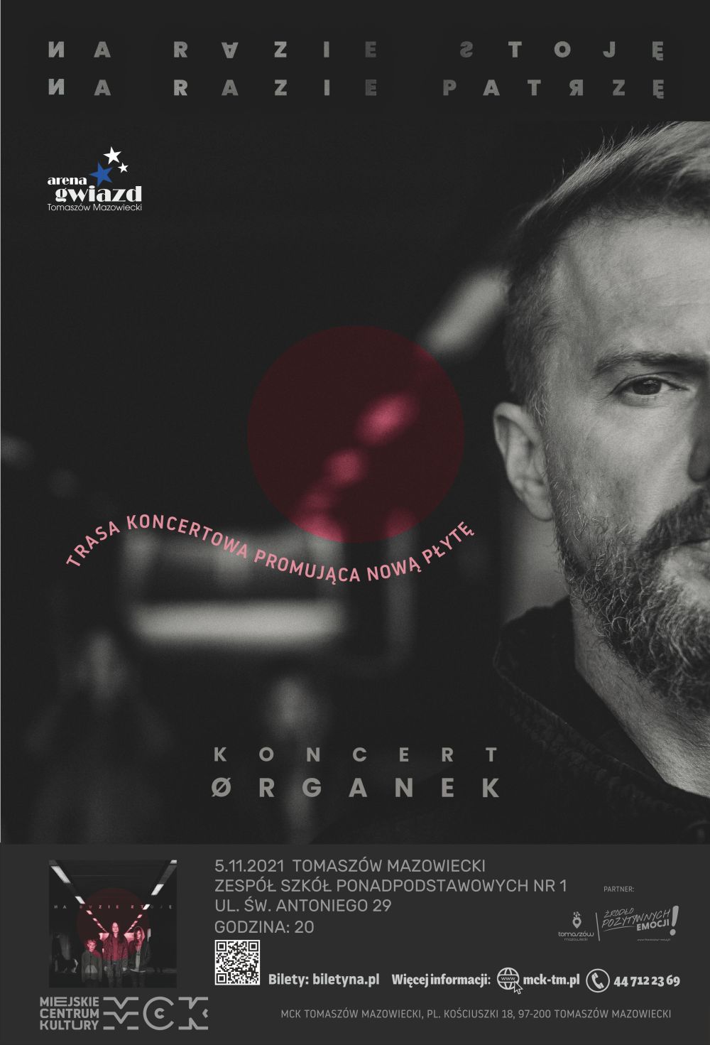 Tomasz Organek z zespołem wystąpi w ramach cyklu Arena Gwiazd, którego inicjatorem jest Miejskie Centrum Kultury. Jednocześnie Tomaszów będzie jednym z miast na trasie promującej najnowszą płytę Ørganka "Na razie stoję, na razie patrzę". Oprócz typowych dla artysty tekstów o międzyludzkich relacjach pojawiają się tam też wątki publicystyczne komentujące zjawiska społeczne w Polsce ostatnich lat. Koncert zostaje jednak przeniesiony z Areny Lodowej do Zespołu Szkół Ponadpodstawowych nr 1 przy ul. św. Antoniego 29. - Zmiana miejsca jest od nas niezależna - mówi Marzanna Majewska z MCK.