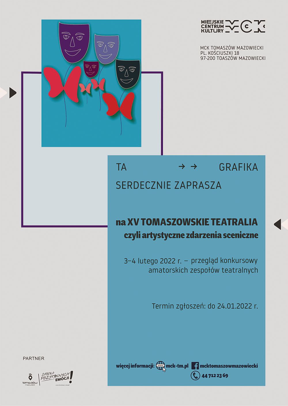 Uczestnicy mogą zaprezentować m.in.: spektakle, teatr cieni, psychodramę, pantomimę, musical, dialog, monolog, monodram itp. Na zwycięzców czekają Złote, Srebrne i Brązowe Maski. - Przegląd konkursowy planowany jest 3-4 lutego 2022 roku w Miejskim Centrum Kultury Tkacz przy ul. Niebrowskiej 50. Zgłoszenia przyjmowane będą do 24 stycznia. Należy je dostarczyć osobiście lub pocztą tradycyjną na adres: Miejskie Centrum Kultury, pl. Kościuszki 18, 97-200 Tomaszów Mazowiecki albo przesłać elektronicznie na adres:
