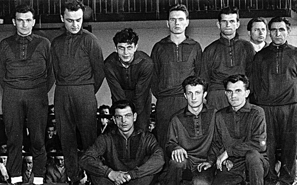 Fot. Rok 1961. Drużyna KS Pilica przed meczem bokserskim. Stoją od prawej: Błaszczyk, Twardowski (trener), Paczkowski, Gajda, Stępniak, Sołtysiak, Gieraga. Klęczą od prawej: KOŁODZIEJSKI JAN, Marażewski Wacław i Bąkowski Jan
