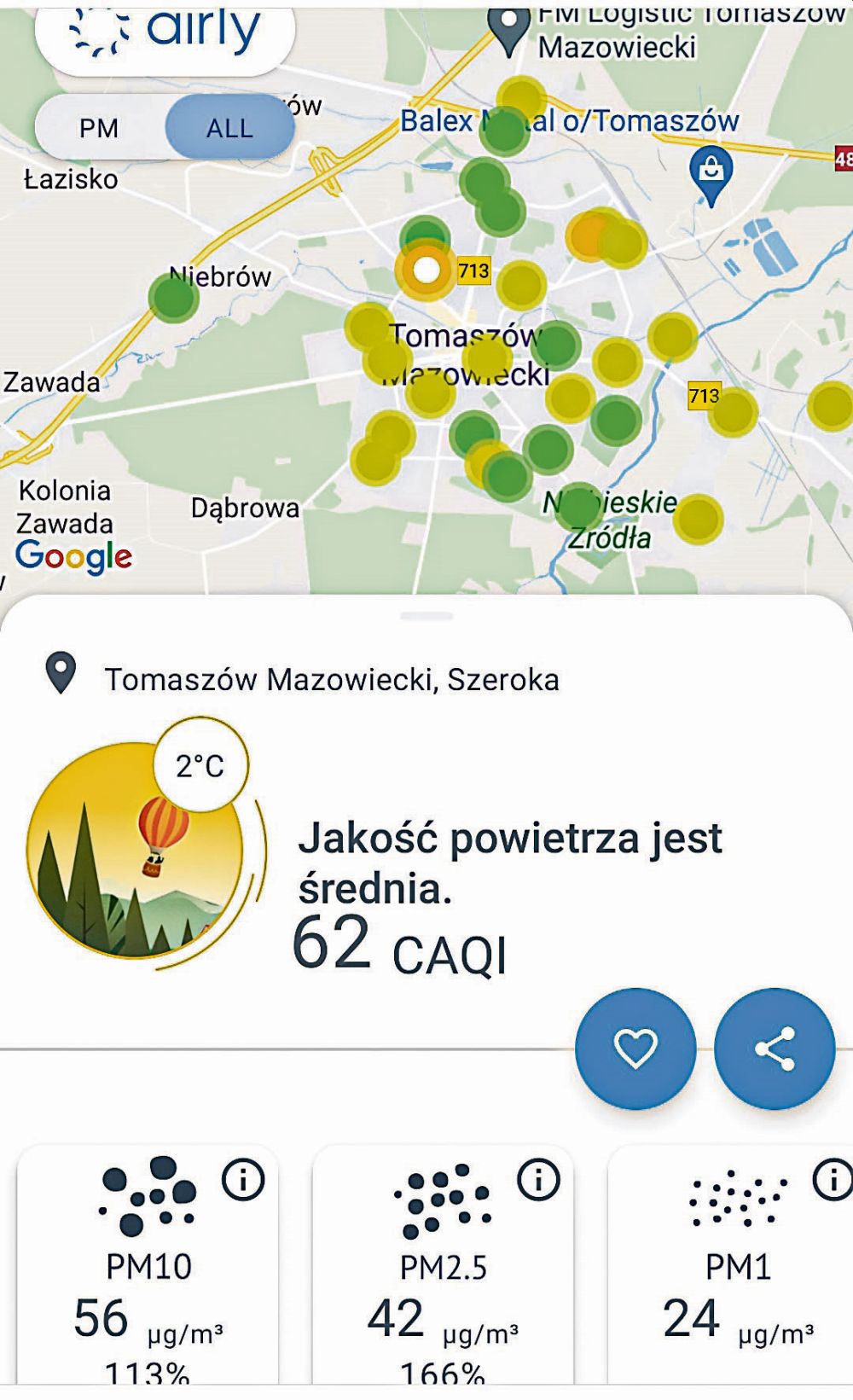 Najgorzej było przy ul. Popiełuszki, gdzie jeden z sensorów zanotował przekroczenie norm stężenia pyłów PM2,5 na poziomie 126 proc. Indeks jakości powietrza w tym miejscu wyniósł 52 CAQI.